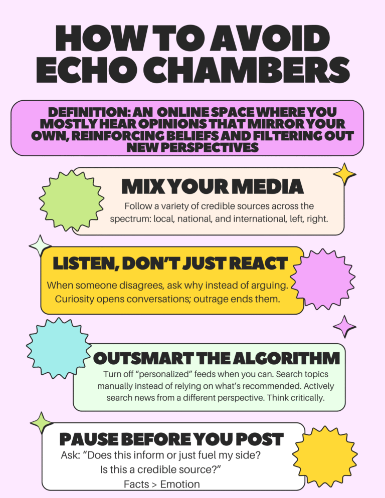 Echo chambers make the impacts of AI, deepfakes, and mis/disinformation even more dangerous. They trap people in spaces where they only see content that reinforces what they already believe. As algorithms personalize feeds and filter out opposing viewpoints, false or AI-generated information becomes easier to accept because it appears to “fit” what someone already thinks. This makes deepfakes and manipulated media even more convincing, allowing misleading narratives to spread faster and blend into everyday content without people realizing it. When individuals are only exposed to one side of an issue, their ability to think critically weakens, polarization grows, and trust in institutions breaks down, which are all major warning signs of democratic backsliding. Echo chambers don’t just shape opinions, they shape entire information environments, making it crucial to seek out credible sources, listen with curiosity, and pause before sharing so that misinformation loses its power.